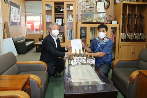 アルコール度数78度の泡盛「花酒七十八度」600ml240本、長命酢180ml350本を新型コロナウィルス感染症の予防に役立ててほしいと崎元酒造所が与那国町へ寄贈。