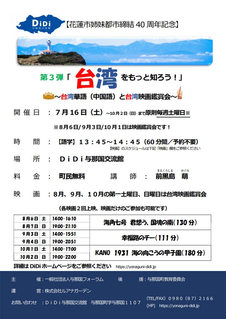 7月16日(土)13:45~、DiDi与那国交流館にて、「台湾をもっと知ろう!」~台湾華語(中国語)と台湾映画鑑賞会~を開講します。