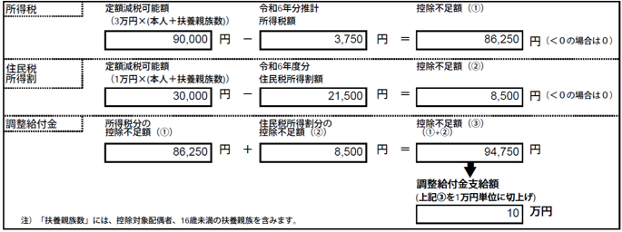 1人を扶養(注4)、令和5年分所得税3,750円・令和6年度住民税所得割(減税前)21,500円の納税者の場合
