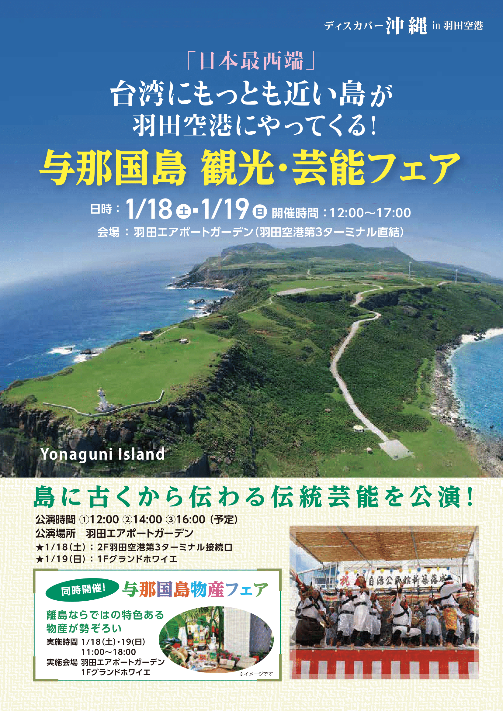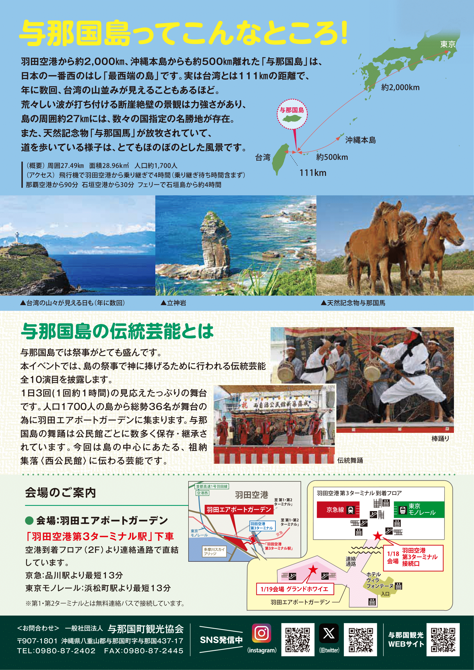 与那国島より西棒座、西舞踊座による伝統芸能を観ることができますので、羽田空港第3ターミナルまでお越しください‼